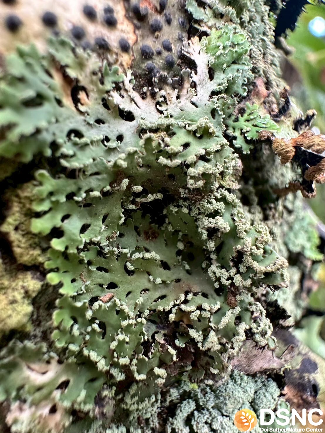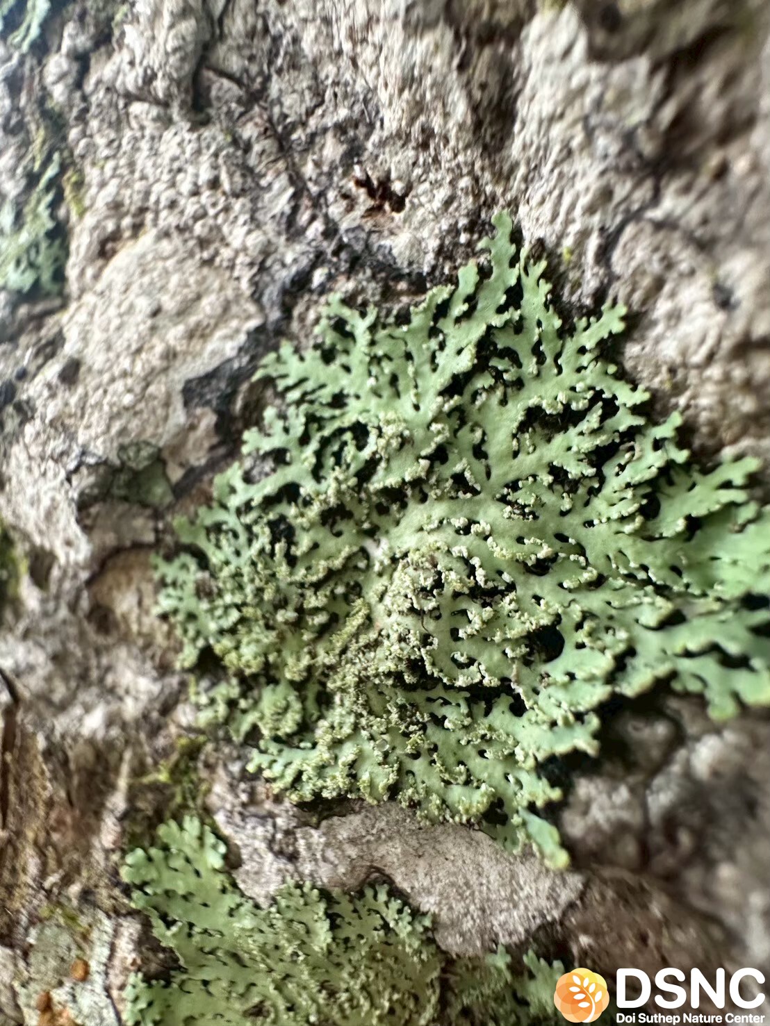 Thallus มีสี เทาอ่อนถึงเทาอมเขียว แผ่กว้างเป็นแฉกชัดเจน ผิวเรียบหรือมีรอยย่นเล็กน้อย ขอบใบหยัก มี cilia (ขนเส้นเล็กสีเข้ม) ยื่นออกมาชัดเจน ซึ่งเป็นลักษณะจำเพาะของสกุล Heterodermia