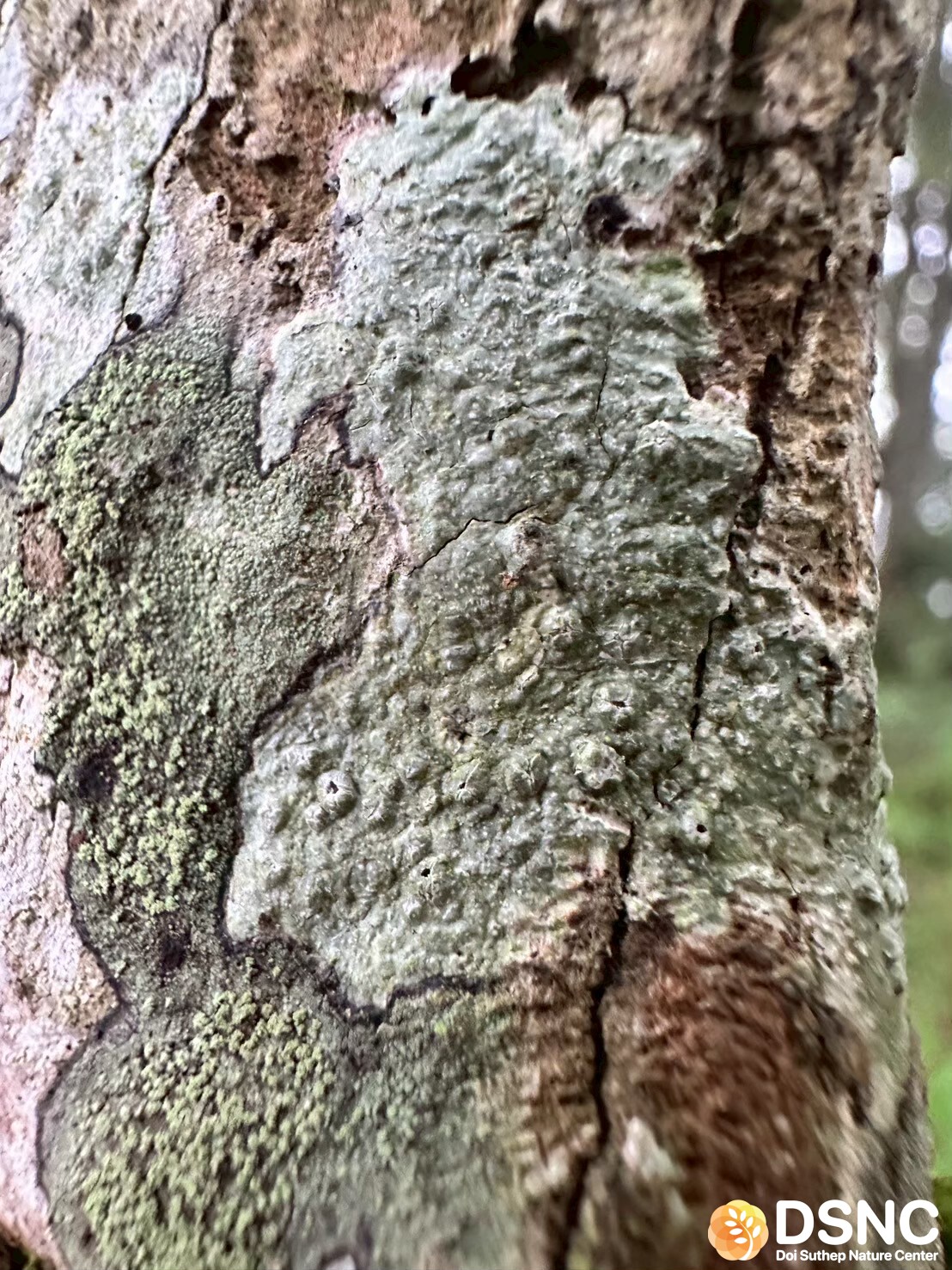 ไลเคนกลุ่ม crustose ลักษณะ บาง แนบติดผิวเปลือกไม้ สี เทา เทาอ่อน ขาวนวล หรือเขียวอมเทา ผิวเรียบหรือแตกเล็กน้อย ขอบเขตไม่ชัดเจน