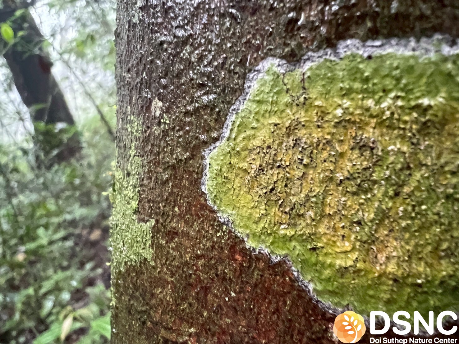 ไลเคนกลุ่ม crustose แนบติดกับพื้นผิว เช่น เปลือกไม้หรือหิน พบมากใน ป่าดิบชื้นและป่าดิบเขา Thallus บาง มีสีเขียวเข้ม น้ำตาลเขียว หรือเขียวอมทองแดง ผิวเรียบ มันวาวเล็กน้อย และไม่มีขอบเขตชัดเจน