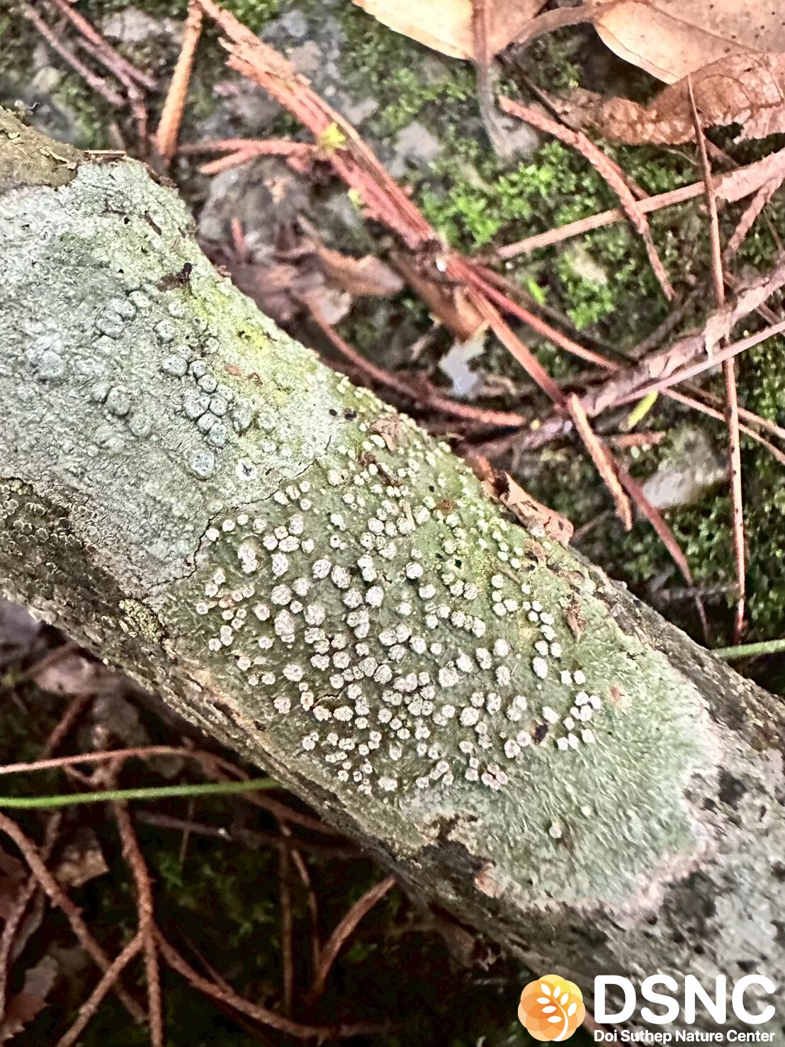 ไลเคนกลุ่ม crustose ลักษณะบาง แนบผิวเปลือกไม้อย่างแน่น สี ขาวนวล เทาอ่อน หรือเทาอมเขียว ผิวเรียบหรือแตกเล็กน้อย ขอบเขตไม่ชัดเจน