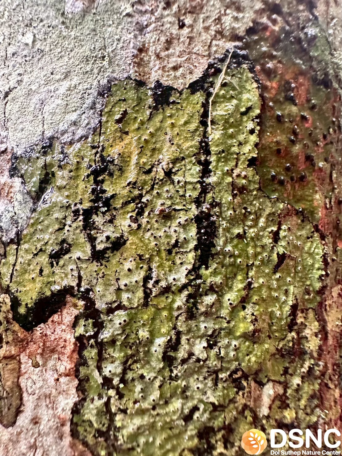 เป็นไลเคนกลุ่ม crustose หรือบางครั้งมีลักษณะคล้าย fruticose-like crustose แนบติดบนเปลือกไม้ สี เทาอ่อนถึงน้ำตาลอมเขียว ผิวเรียบหรือแตกเล็กน้อย
