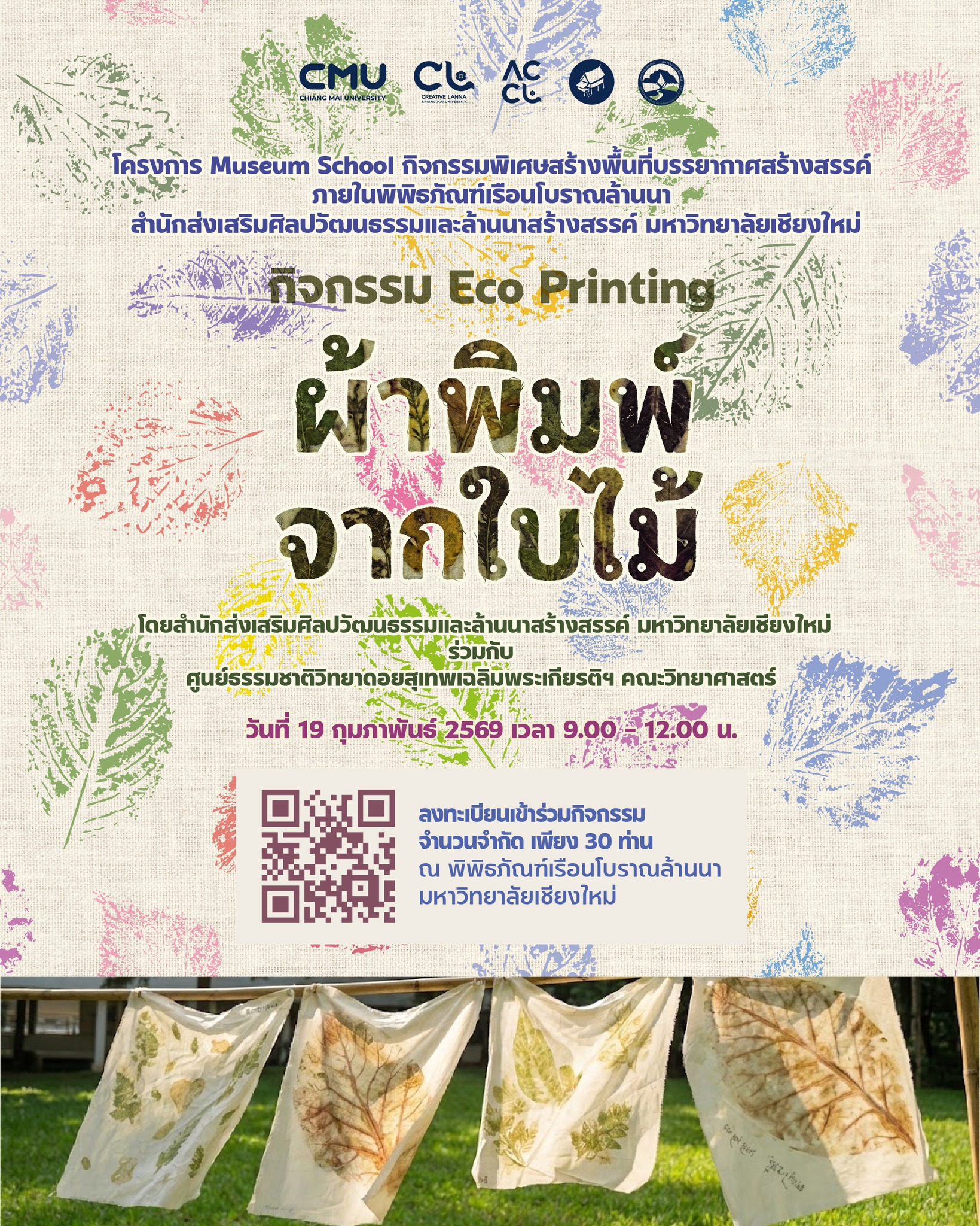 พิพิธภัณฑ์เรือนโบราณล้านนา มช. ขอเชิญเข้าร่วมกิจกรรม Eco Printing ผ้าพิมพ์จากใบไม้ ในวันที่ 19 กุมภาพันธ์ 2569 เวลา 09.00-12.00 น. ณ พิพิธภัณฑ์เรือนโบราณล้านนา มช.