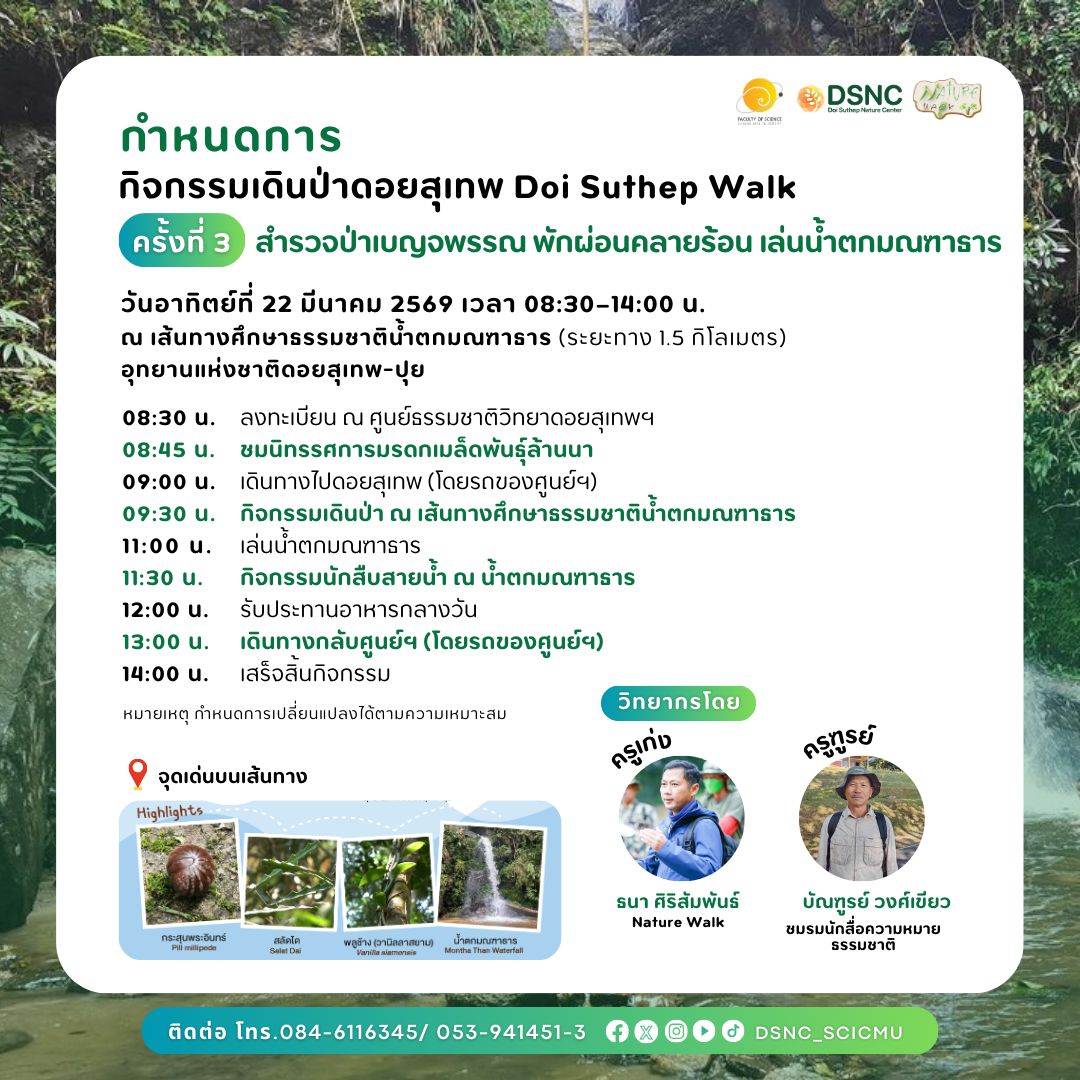 เปิดสมัคร! ผู้สนใจเดินป่า กับกิจกรรมเดินป่าดอยสุเทพ Doi Suthep Walk ครั้งที่ 3/69 "สำรวจป่าเบญจพรรณ พักผ่อนคลายร้อน เล่นน้ำตกมณฑาธาร" วันอาทิตย์ที่ 22 มีนาคม 2569 เวลา 08:30–14:00 น. ณ เส้นทางศึกษาธรรมชาติน้ำตกมณฑาธาร (ระยะทาง 1.5 กิโลเมตร) อุทยานแห่งชาติดอยสุเทพ-ปุย